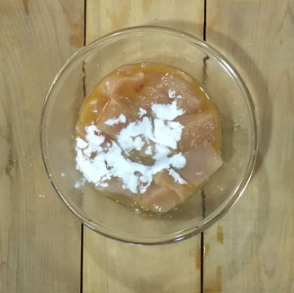 2. 醃料。將雞蛋打入雞肉丁抓勻,並取2大匙柳丁汁、少許醬油,最後再加 入1-2匙玉米粉抓均勻!